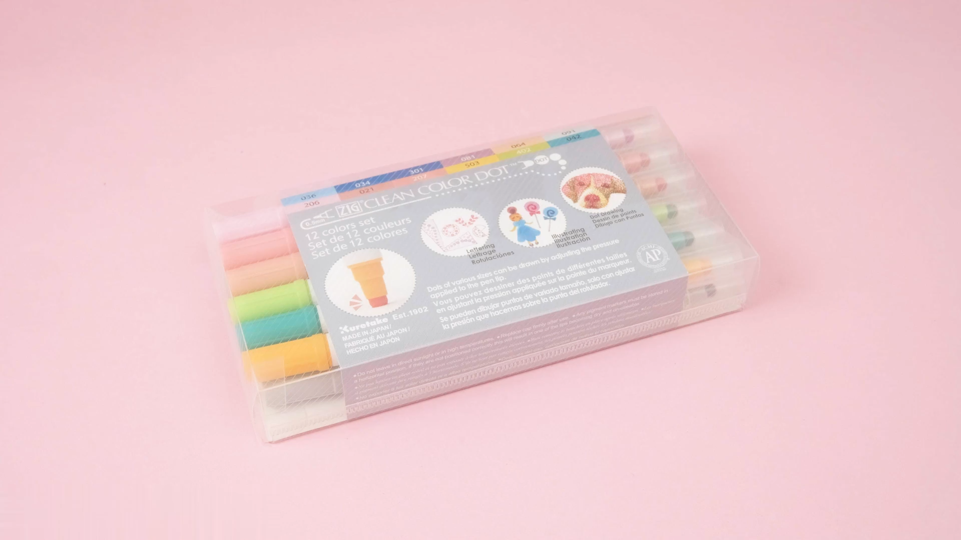 Zig Clean Color Dot 12 colors set is dual-tip markers with a 0.5mm fine tip on one end and a flexible dot tip on the other. It is water-based, layer-able pigment ink. There are 12 colors-Salmon, Blue-bonnet, Demin, Ocean, Fawn, Hyacinth, Platinum, Candy Pink, Island coral, Splash, Kiwi, and Summer sun.